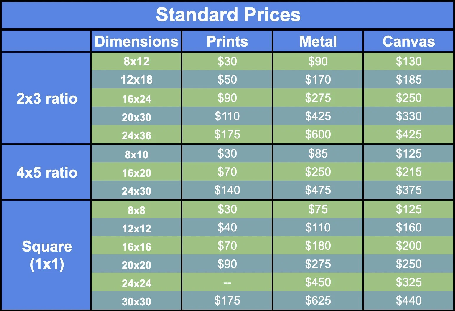 If you would like to appreciate my work, but a specific piece seems out of reach, please reach out to me personally and I can see what I can do. To the right is an example of my 2022 pricing. Due to the high rate of inflation currently ocurring I’ve had to adjust my prices. They may continue to change at different points in the year if costs go up or if I am offering a sale. Almost every piece can be cropped and printed at a different size than is offered in the store so don’t hesitate to ask.